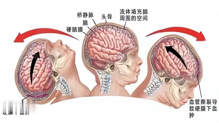 剧烈摇晃会使大脑在颅骨内来回撞击,轻则造成脑部微小血管破裂,形成颅内出血,重则直接导致脑神经损伤,这就是医学上说的婴儿摇晃综合征。